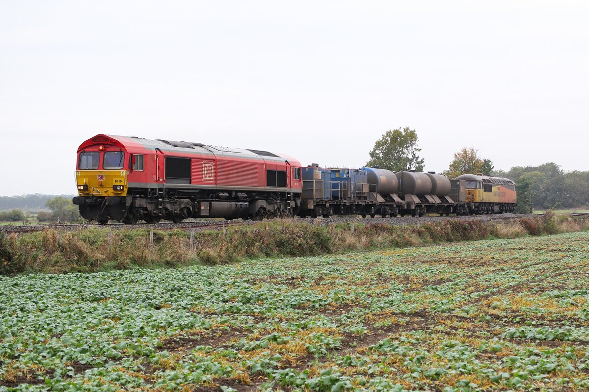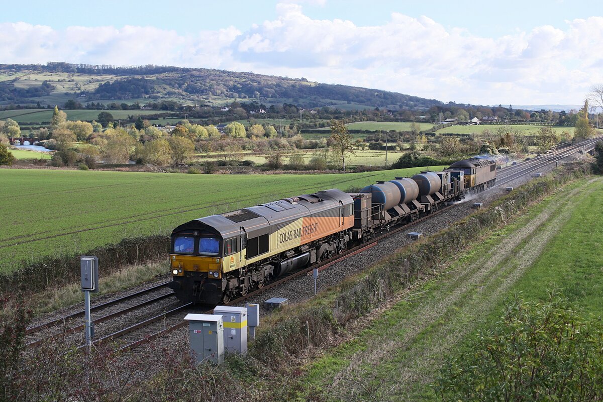 A clean Colas Class 66, probably replacing a grubby 56 like the one at the rear of this train, which is heading north at Defford.