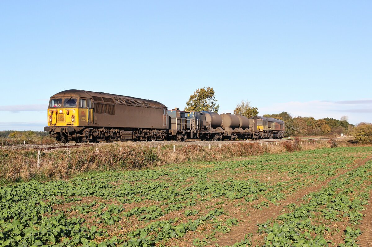 A very grubby Colas RHTT set travelling south through fields north of Defford.